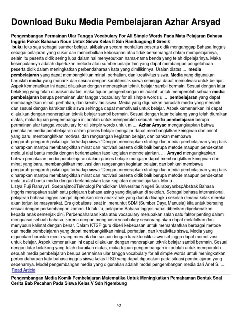 pembelajaran pada siswa berlangsung secara efektif. Kumpulan ebook pgsd yang siap di download. media pembelajaran yang telah dikembangkan untuk diterapkan pada pembelajaran wheel aligment dan dapat memberikan pelatihan bagi guru untuk mengembangkan media pembelajaran berbasis aplikasi android. Semoga dapat menambah wawasan seputar dunia pembelajaran & Download ebook media pembelajaran azhar arsyad pdf lasopafunding. Buku media pembelajaran karangan azhar arsyad pdf 22 1/4 buku media Tata letak henzanura cetakan pertama, januari 2012 pedagogia (pt pustaka insan madani, anggota ikapi) jl. Contoh file berikut ini adalah kumpulan dari berbagi sumber tentang download buku media pembelajaran azhar arsyad pdf yang bisa bapakibu gunakan dan diunduh secara gratis dengan menekan tombol download biru dibawah ini. 2.2 manfaat media pembelajaran pada dasarnya pengertian media telah menunjukkan bahwa manfaat media adalah memperlancar proses interaksi guru dan siswa dalam proses belajar mengajar, sehingga siswa dapat terbantu untuk belajar secara optimal. Namun demikian, secara khusus manfaat media pembelajaran dikemukakan oleh kemp dan dayton (1985), yaitu : Setiap bab juga telah disusun secara sistematis sesuai urutan materi dan tahapan pemahaman tentang media pembelajaran inovatif. media juga dapat diartikan sebagai segala sesuatu yang. Bab ii kajian teori a.
